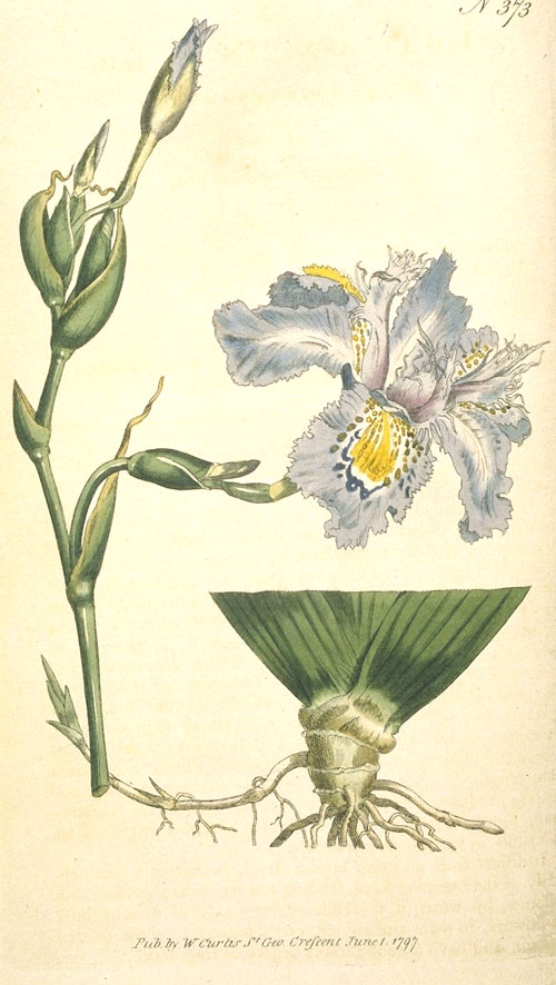 El lirio de Japón (iris japonica), también es llamado “iris con flecos”, “shaga” o “flor de mariposa”, es nativa de las colinas boscosas de Japón, se introdujeron a Europa en 1792, gracias a Carl Peter Thumberg, empleado de la Compañía Holandesa de las Indias Orientales, quien la nombró y pudo recolectar una gran variedad de plantas durante la época en que ingresar a Japón estaba prohibido para la mayoría de los europeos.